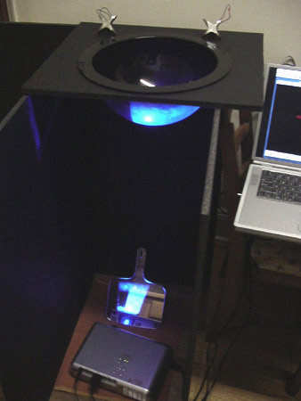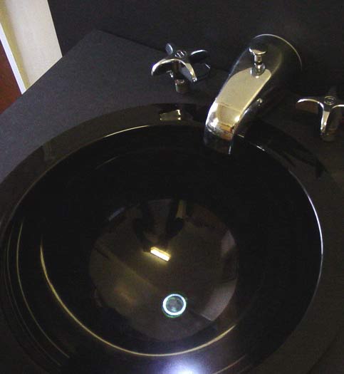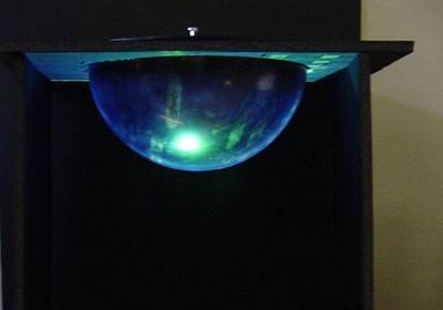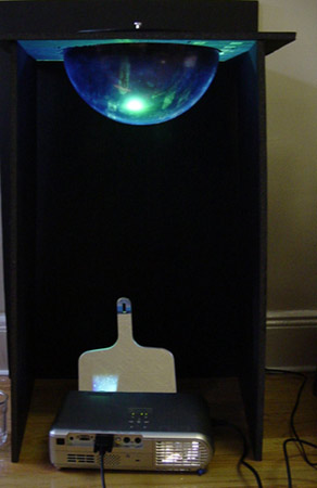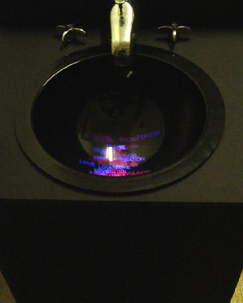 I use a translucent security-cam cover for the sink bowl. A projector is hidden in the compartment below. The words are projected upwards onto the bottom of the curved surface. A mirror helps to flip the words so they appear correctly on the topside of the bowl. The mirror also helps to increase the throw distance of the projector.