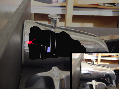 I transform the drain lever into a switch using a photocell and LED. When the lever is lifted, the photocell raises into the path of the LED. This tells the "virtual drain" to close, and the dripping words begin to accumulate and jitter like collecting sink water. When the drain lever is pressed back down, the collecting words disappear into the open drain.