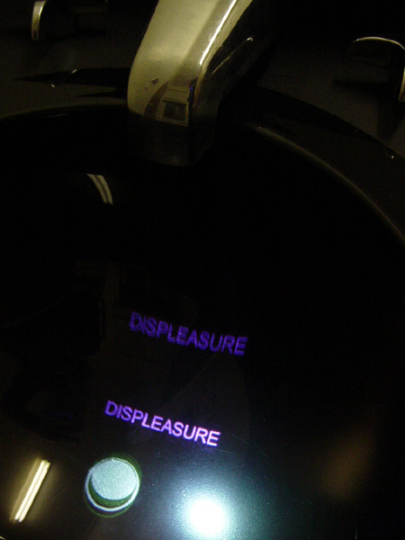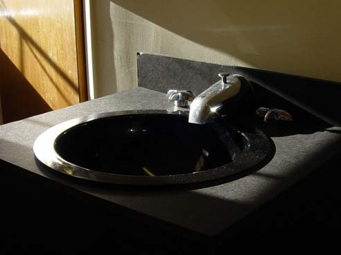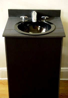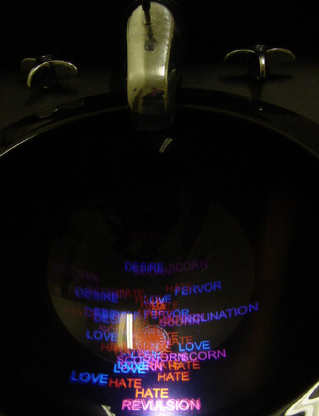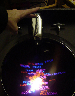 I program a BX-24 chip to read two potentiometers attached to the hot and cold handles. Depending on the position of these handles, the words "LOVE," "HATE" and a spectrum of words in between fall from the faucet into the basin. When both handles are turned in equal measure, the word "APATHY" pours into the sink. The more you turn each knob, the faster the words fall.